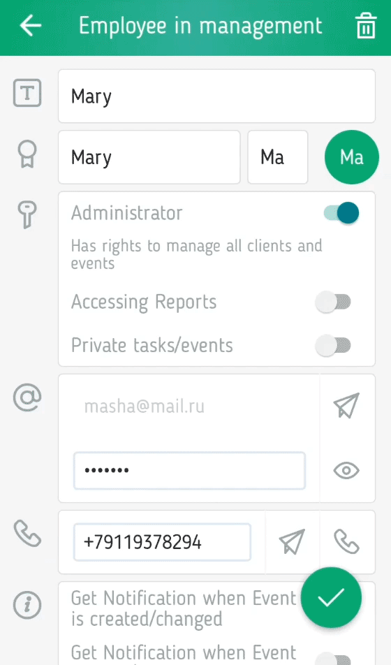 Nur der Administrator kann die Konten erstellen und Passwörter zu ihnen ändern. Der Mitarbeiter kann die Rechte des Administrators erhalten, so dass er vollen Zugriff auf die Kundenbasis, auf alle Veranstaltungen und Aufgaben hat. Allerdings kann es im Zugang zu Berichten eingeschränkt werden, so dass die Ergebnisse der Arbeit des Unternehmens nur für Administrator zur Verfügung stehen.