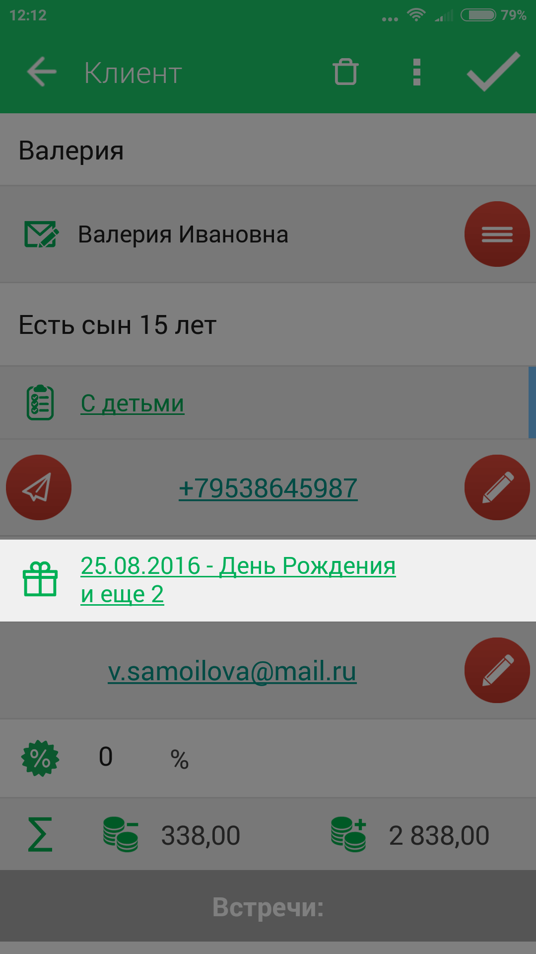 Прямо отсюда можно позвонить Клиенту или отправить ему SMS.